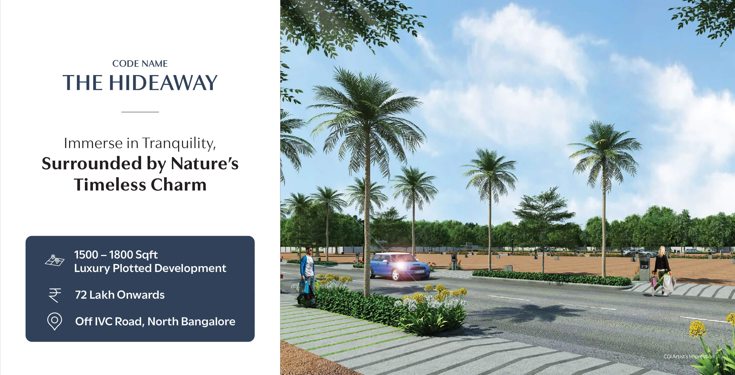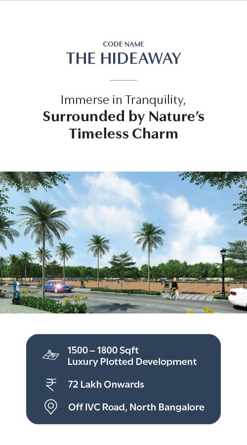 Code Name: The Hideaway is a luxury plotted development nestled off IVC Road, North Bangalore. Designed for those who seek a private retreat amidst nature, this exclusive enclave offers premium plots ranging from 1,500 to 1,800 sq. ft., starting at ₹72 lakh onwards. Thoughtfully planned with lush landscapes and modern infrastructure, it provides the perfect canvas to build your dream home. With excellent connectivity and proximity to key hubs, The Hideaway ensures a serene yet well-connected lifestyle, making it an ideal investment for the future.